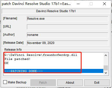 9、以管理员身份运行【davinci.resolve.studio.17b1-patch+EasyDCP.exe】,取消勾选【Make Backup】,点击patch
