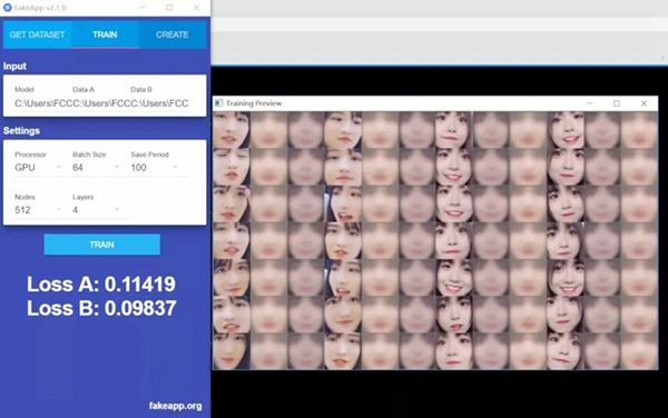 值得一提的是,训练进度会被实时保存下来,也就是说你可以随时暂停训练,在预览窗口中,输入英文小写字母q即可保存退出,下次想要继续训练的话,打开FakeApp再点击TRAIN即可