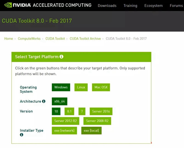 接下来就是和GPU相关的CUDA8了,选择相应的系统版本便可以下载安装。在安装方式这一步建议大家使用本地安装exe[local]的方式,exe[network]的安装方式….可能有点慢。默认情况下CUDA会自动帮你添加到环境变量,如果没有,请手动添加,这一步非常重要
