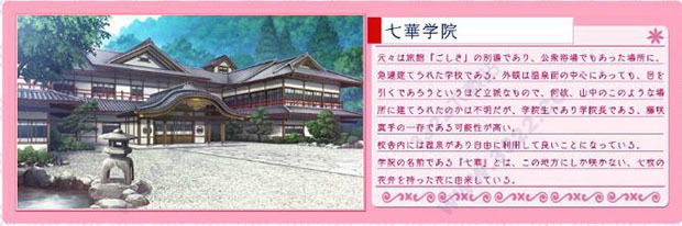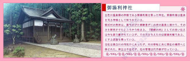 御式村的起源:逃亡到远处的修炼者浸泡了这块土地上的温泉,从这里开始拥有了让花开放的能力。这作为「修炼之地」的传说一直流传到今日,而“这种力量的传承者就是御汤利”这样的逸闻也一直延续着。