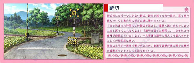 被传说「在某些特定的时间通过这个道口的话,会迷失在灵界最终无法再次返回」、「在跨过道口的一瞬间,(现实中)已经过了10年的时间」等等,咋一看上去是普通的道口,但是作为闹鬼地点的知名度很高。