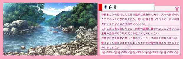 神社旧址不知道在奥白川哪里,但与村子的搬迁一起被移动到了现在的地方。虽然没有神主,但神社的管理交由円乃(PS.详见配角介绍)家了。