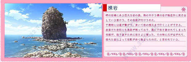 关于变红的岩石表面也有传闻留下。为了接回去疏通岛的孩子们的母亲,预先登上了岛。那个时候指甲被剥落,由于流出的血把岩石染红了,传言是这么说的。