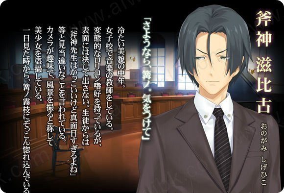 有着冷漠美貌的中年。在女子学校里是音乐老师。有着变态的萝莉控嗜好,但绝不会暴露于表面。